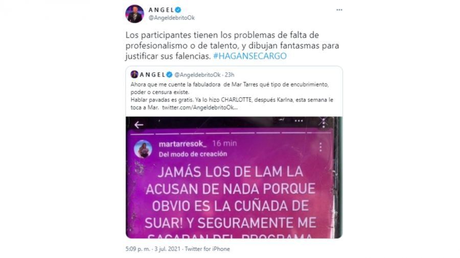 Antes de la renuncia de Mar Tarrés a La Academia, Ángel de Brito salió con todo a responderle después de que apuntó contra Los Ángeles de la Mañana (El Trece) por no acusar a Judith Kovalovsky por ser pareja del hermano de Adrián Suar. El conductor de LAM no se la perdonó y la trató de fabuladora.