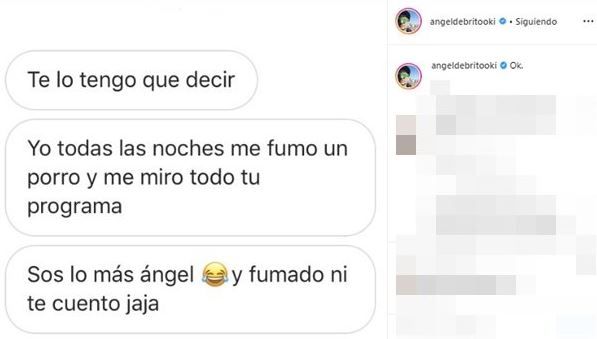 Sin comprender si se trataba de una broma, un ataque o un halago, Ángel de Brito mostró el posteo de alguien que le puso: “Te lo tengo que decir. Yo todas las noches me fumo un porro y me miro todo tu programa. Sos lo más Ángel. Y fumado ni te cuento”, sin dar a conocer el nombre del usuario.