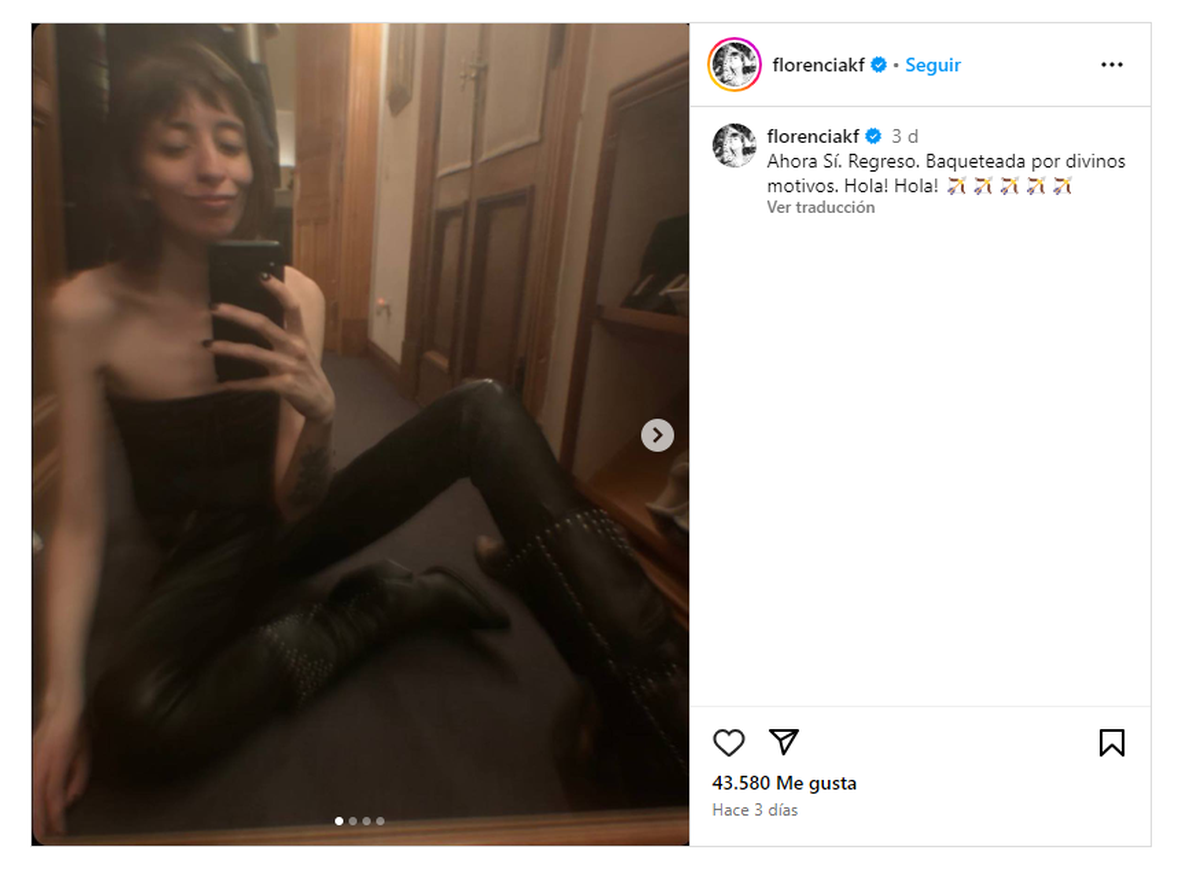 Estas fotos marcan el regreso de Florencia a las redes sociales, un espacio del que se había mantenido alejada, prefiriendo un perfil bajo y dedicándose más a sus intereses personales, como la lectura y la promoción de libros, además de compartir momentos de su vida personal y familiar.