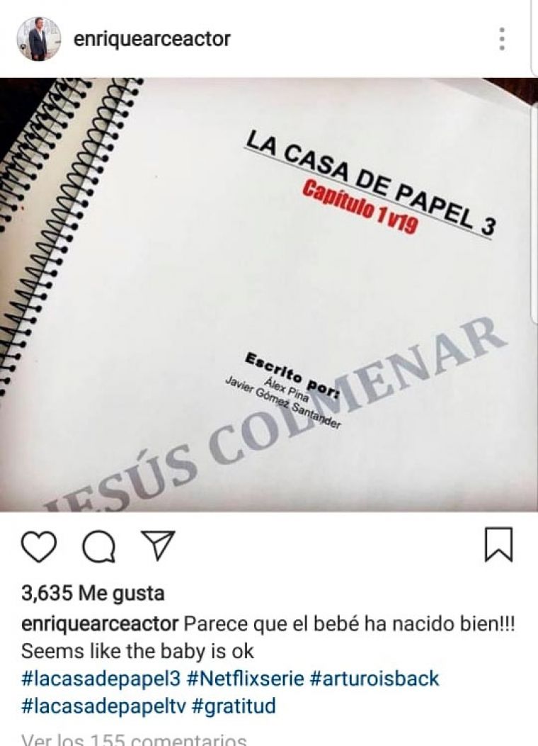 Sin embargo, el actor que interpreta a Arturito, Enrique Arce, dio un paso más y contó en Instagram que ya tiene el guión en su mano y está listo para grabar. “¡¡¡Parece que el bebé ha nacido bien!!! Seems like the baby is ok. #Lacasadepapel3 #Netflixserie #Moneyheist #Lacasadepapeltv #Gratitud”, escribió el actor, que se puso en la piel de un rehén en el atraco a la Fábrica de Moneda y Timbre de España.