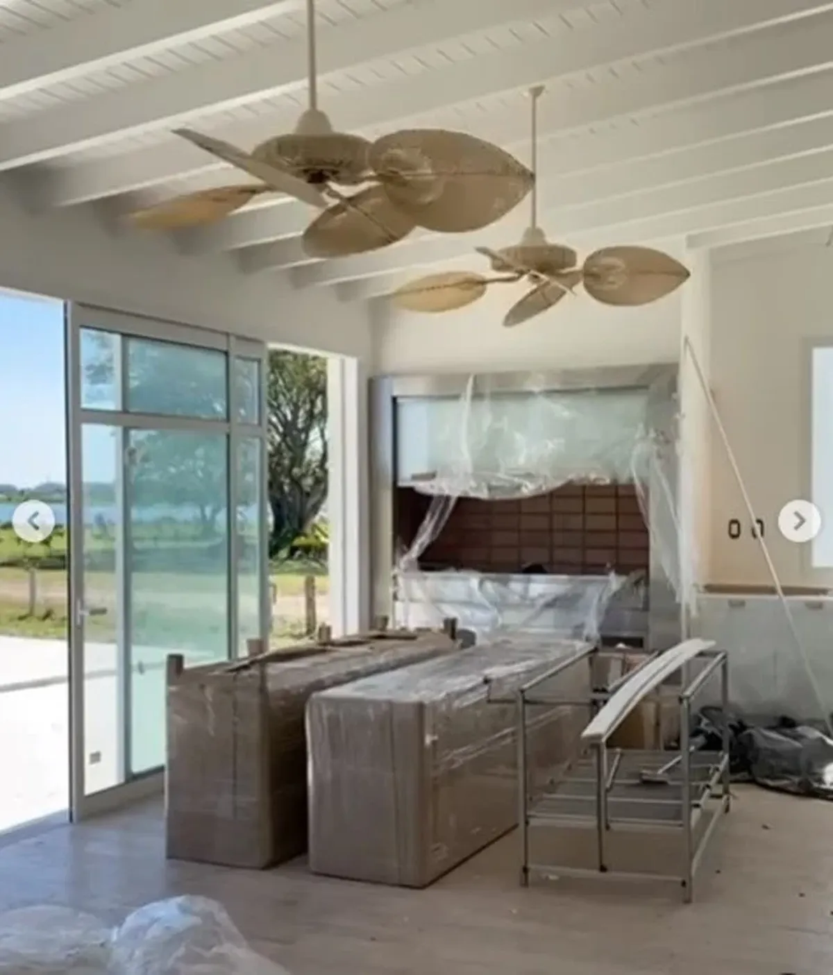 Entre latas de pintura, escaleras y herramientas, la bailarina mostró que ya tiene algunos muebles, todos en los mismos tonos claros. También en lo que será el amplio living, ya hay en funcionamiento algunos ventiladores de estilo asiático, con hojas de ratán artesanales.