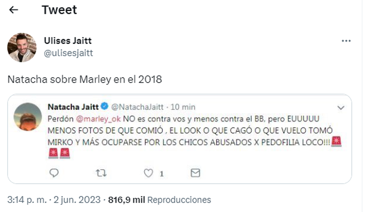 Los dichos sobre Marley de Natacha Jaitt que reflotó Ulises Jaitt