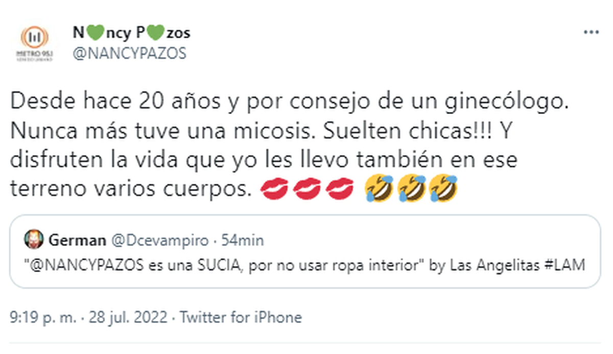 Un usuario se hizo eco de la frase y se la hizo llegar -un poco tergiversada- a la protagonista de la caída a través de Twitter. “‘Nancy Pazos es una sucia, por no usar ropa interior’ by Las Angelitas #LAM”, escribió arrobando a la periodista.