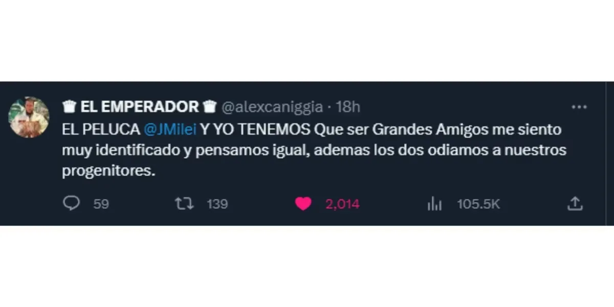 El Emperador manifestó su aprecio al candidato a presidente y aseguró que quiere ser su amigo. "El Peluca Javier Milei y yo tenemos que ser grandes amigos. Me siento muy identificado y pensamos igual", escribió el conductor de Los Desconocidos de Siempre.