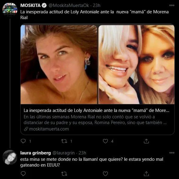 Ya pasaron unos días desde que se rumoreó la pelea entre More y Loly y en Twitter no dejaron pasar la oportunidad para referirse al tema. En una de las publicaciones que se hicieron eco de este asunto, un usuario de la red social del pajarito fue muy duro con la modelo que actualmente está radicada en los Estados Unidos. “Esta mina se mete donde no la llaman! que quiere? le estara yendo mal gateando en EEUU?”, escribió @lauragrin.