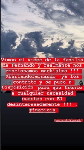 “¡Vimos el video de la familia de Fernando y realmente nos emocionamos muchísimo! ¡Fernando Burlando ya los contactó y se puso a disposición para que frente a cualquier necesidad cuenten con él desinteresadamente! Justicia", escribió Barby en sus redes sociales.