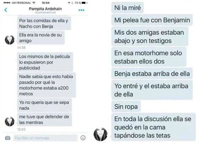 “En esa motorhome solo estaban ellos dos, Benja estaba arriba de ella, yo entré y el estaba arriba de ella, sin ropa. En toda la discusión ella se quedó en la cama tapándose las tetas", detalló la actual jurado de La Academia aquél entonces.