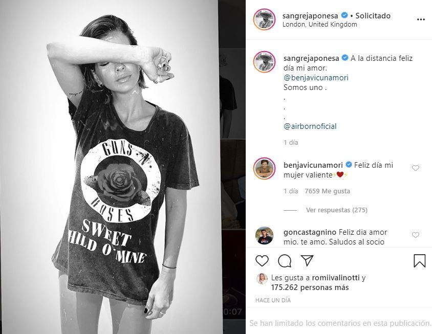 Ella no se quedó atrás a la hora de postear algo especial en el día de los enamorados. Se retrató con una remera de los Guns N' Roses y expresó: "A la distancia, feliz día mi amor. Somos uno". El galán chileno reaccionó de inmediato ¡con las mismas palabras que le escribía a Carolina Ardohain! "Feliz día a mi mujer valiente", dijo.