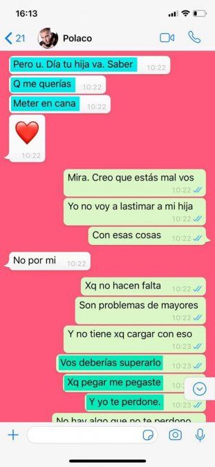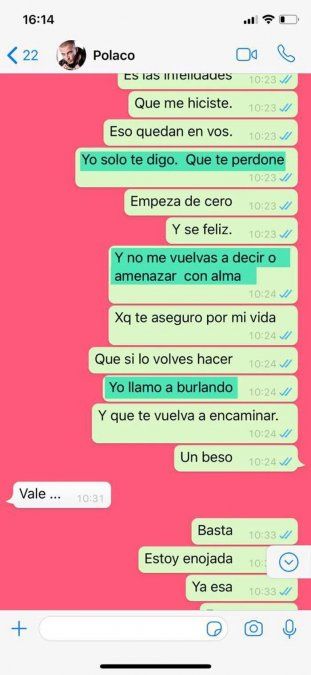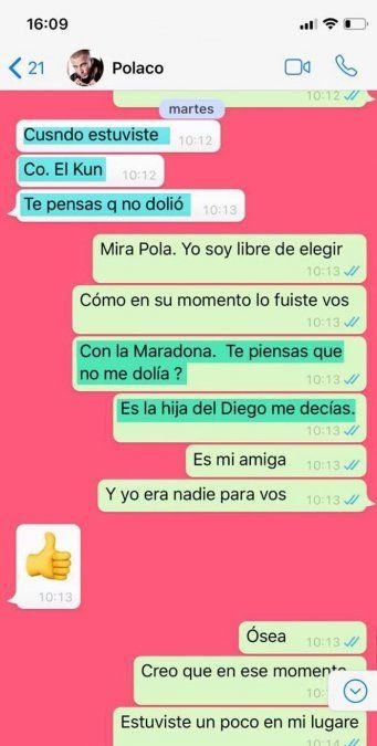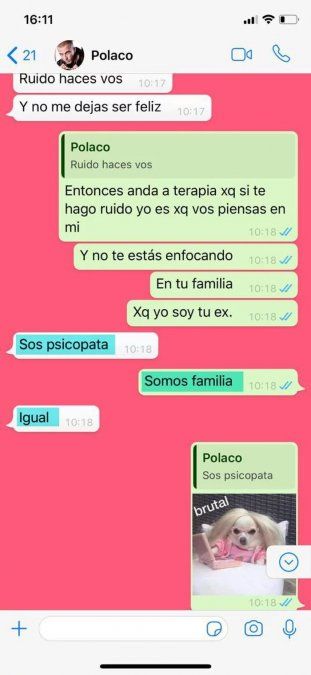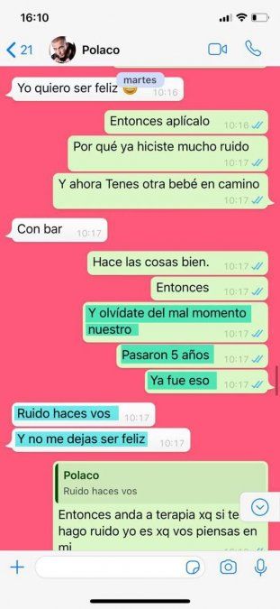 "No me escribas más. Y no me culpes a mí. Es hora de madurar Polaco. Sos un hombre ya. Con tres hijos madura!!!!", le responde ella ante su insistencia de querer dialogar.