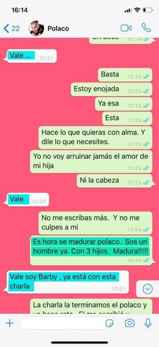 Y allí aparece la actual pareja del cantante, Barby Silenzi, en el chat: "Vale soy Barby, ya está con esta charla". A lo que Aquino le aclaró: "La charla la terminamos el Polaco y yo hace rato. Él me escribió u llamó. Yo sólo le respondí como siempre lo hago".