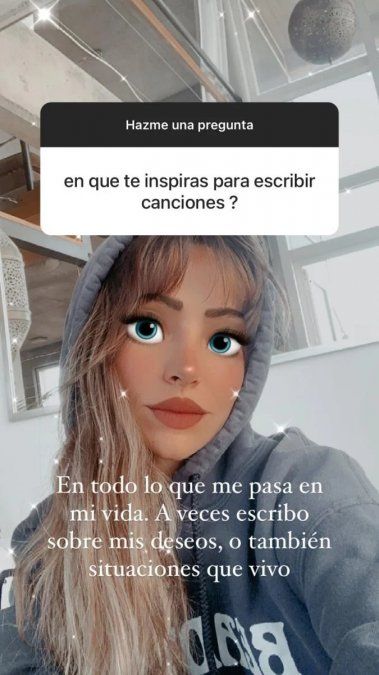 “¿En qué te inspirás para escribir canciones?”, le preguntó otro usuario. “En todo lo que me pasa en mi vida. A veces escribo sobre mis deseos, o también situaciones que vivo”, dijo la actriz y cantante. “¿Cómo hago para enamorarte?”, quiso saber alguien. “Cocinarme rico, cuidarme, ser honesto y contar conmigo...porque doy mucho amor”, reconoció ella.