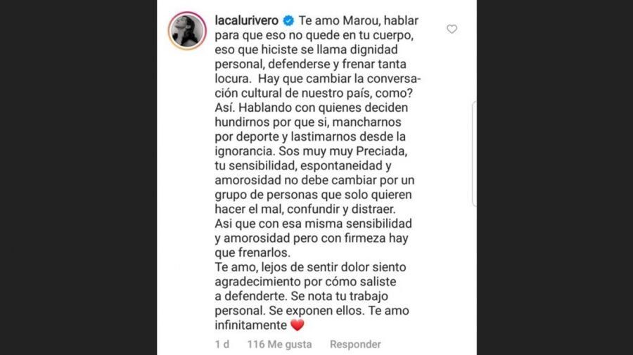 "Te amo Marou, hablar para que eso no quede en tu cuerpo, eso que hiciste se llama dignidad personal, defenderse y frenar tanta locura", comienza el posteo que Calu Rivero dejó en la publicación realizada por Marou, su hermana, en respuesta a los conductores de Intrusos. Y continuó: "Hay que cambiar la conversación cultural de nuestro país, ¿cómo? Así. Hablando con quienes deciden hundirnos porque si, mancharnos por deporte y lastimarnos desde la ignorancia", sostuvo la actriz y modelo argentina, de 34 años de edad.