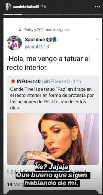 Al ver la publicación de un medio humorístico que tuiteó "Cande Tinelli se tatuó ‘Paz’ en árabe en el recto interior en forma de protesta por las acciones de EEUU e Irán de estos días". Un usuario de Twitter decidió burlarse a partir de la publicación y Lelé no tardó en aclarar las cosas. Desde su cuenta de Instagram compartió la captura de pantalla de las publicaciones hechas esta mañana y escribió encima su descargo, según informa mdzol.