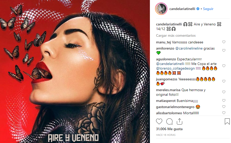Cande Tinelli escribió “Aire y Veneno“ en su cuenta de Instagram acompañando la foto que está relacionada con su nueva canción. La publicación, como siempre, tuvo mucha repercusión. Además recibió muchísimos comentarios elogiando su belleza y su talento. “Vamos Cande”, “Sos hermosa”, “Qué divina” fue sólo algu