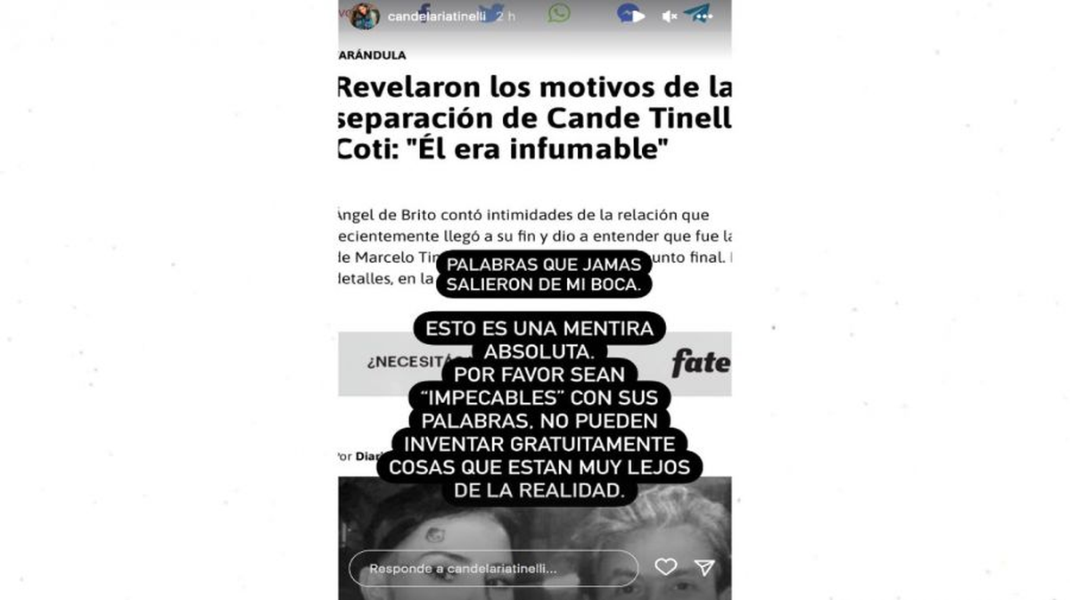 La hija de Marcelo Tinelli usó su cuenta de Instagram, específicamente sus historias, para compartir una captura de una nota que levantó un portal web sobre el tuit en el que De Brito afirmó que ella había dejado al cantante porque "era infumable" y junto a ella escribió: "Palabras que jamás salieron de mi boca. Esto es una mentira absoluta".