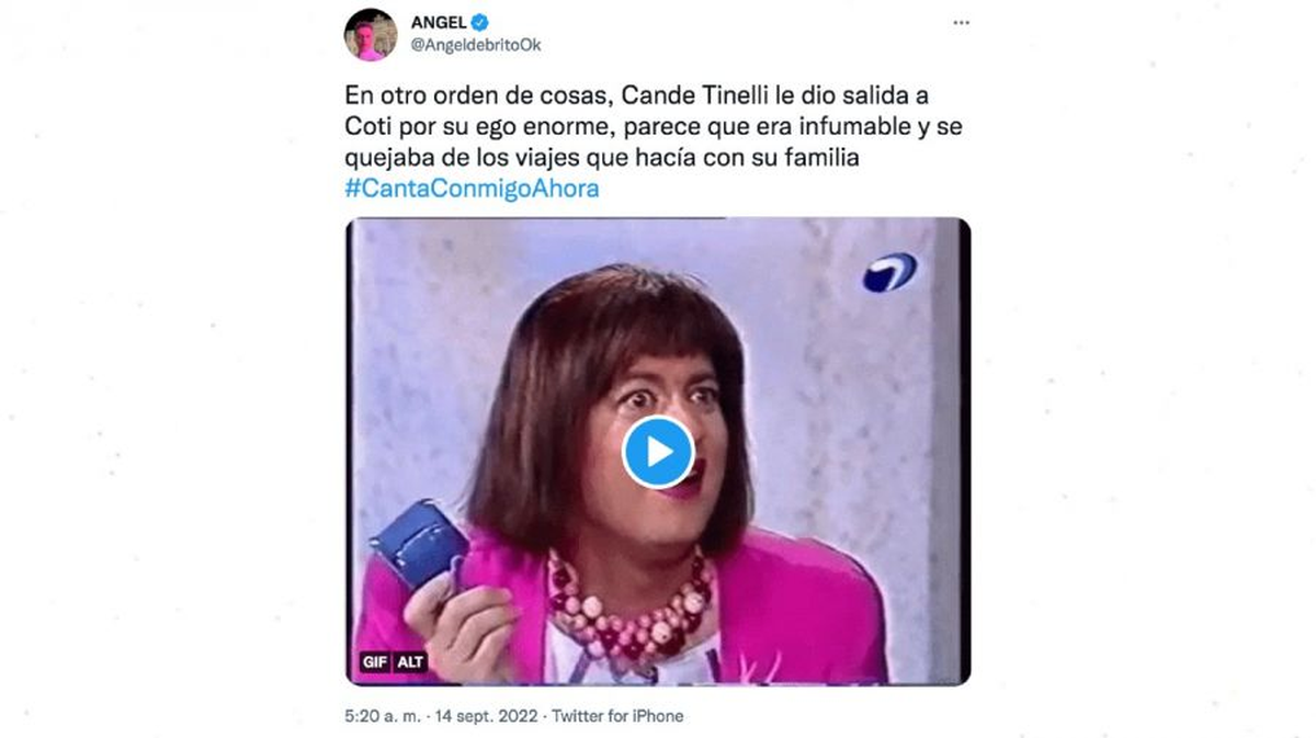 El conductor ofreció más detalles sobre el motivo por el que la hija de Marcelo Tinelli dejó al cantante: "En otro orden de cosas, Cande Tinelli le dio salida a Coti por su ego enorme, parece que era infumable...". Además, Ángel explicó que las constantes quejas de Coti cansaron a Cande: "Se quejaba de los viajes que hacía con su familia #CantaConmigoAhora".