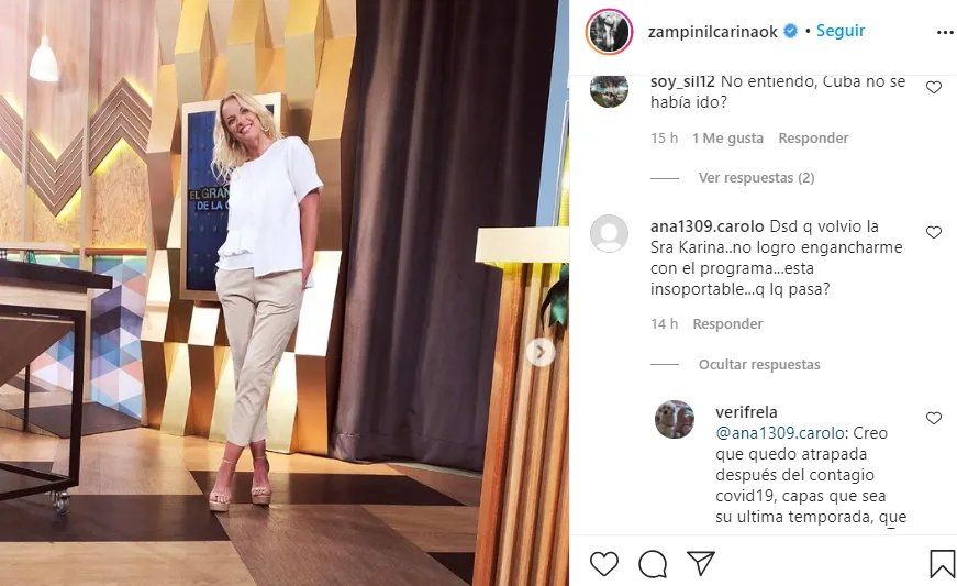 "Lookete de martes @gpcocina @eltrecetv", precisó Carina Zampini en Instagram, sin imaginar lo que vendría después: una ola de críticas. "Desde que volvió la señora Carina no logro engancharme con el programa…está insoportable…Qué le pasa?"; y "Creo que quedó atrapada después del contagio de covid19, capaz que sea su última temporada, que vuelva a las teleseries"; fueron algunos de los picantes comentarios que la conductora estrella cosechó en las redes.