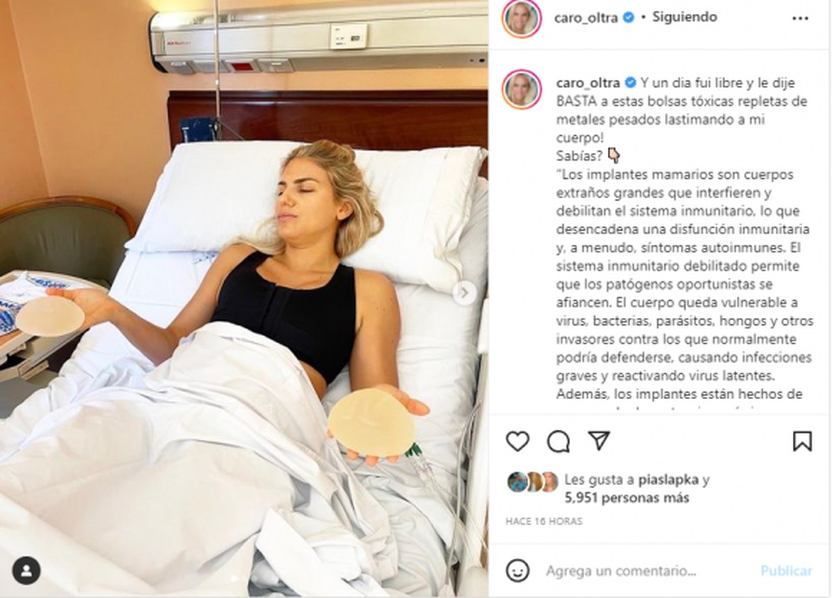 Carolina Oltra tomó una decisión no muy común entre las famosas argentinas: se sacó los implantes mamarios que había llevado en su cuerpo por muchísimos años. Aunque las razones para colocárselos tal vez fueron frívolas, los motivos por el cual la modelo decidió someterse a otra operación para quitárselos tuvieron una sola razón de ser: la salud. Luego de la cirugía, la modelo subió una foto a su Instagram donde se la ve descansando en una cama, sosteniendo los dos implantes que solía llevar: “¡Y un día fui libre y le dije BASTA a estas bolsas tóxicas repletas de metales pesados lastimando a mi cuerpo!”