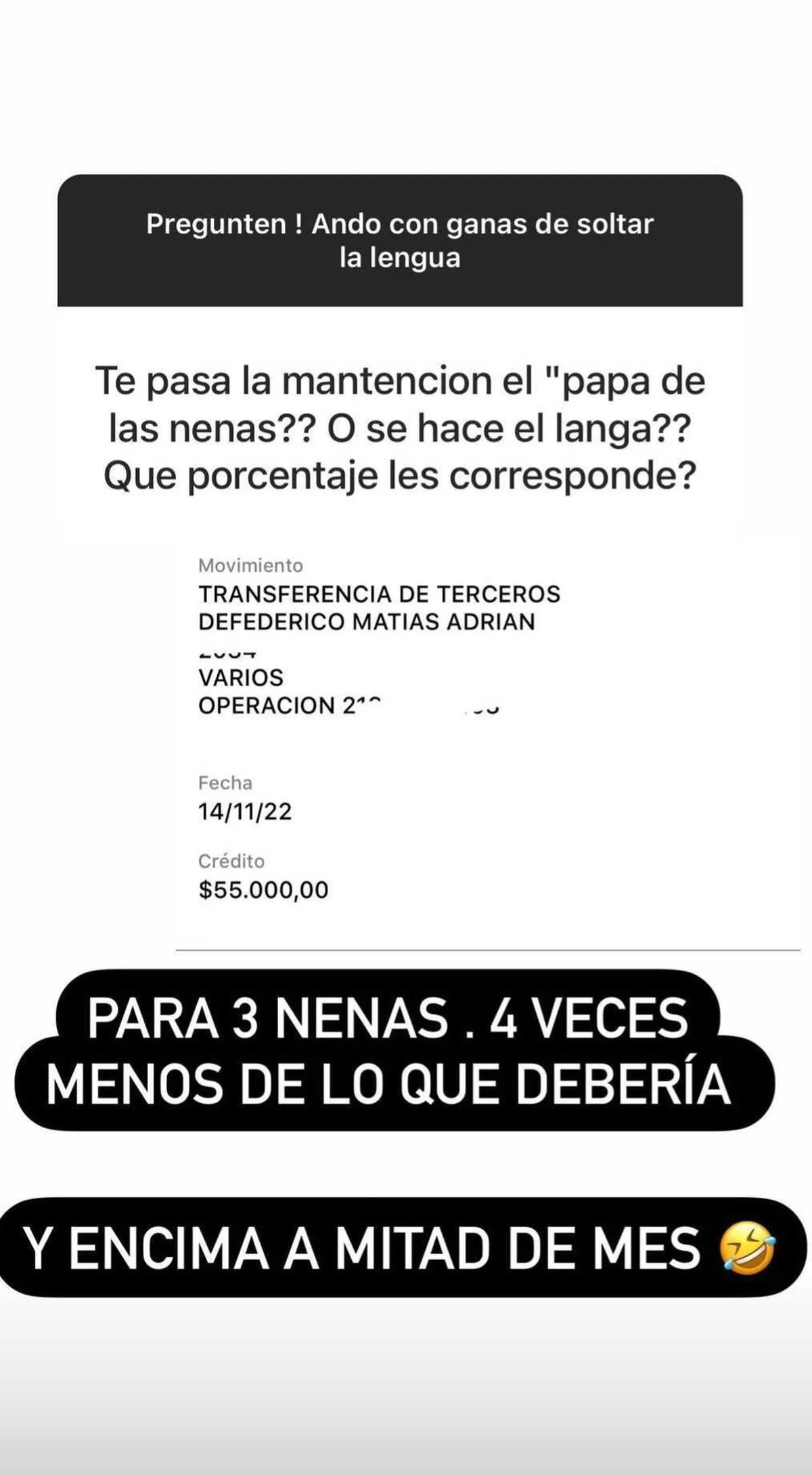 A través de Instagram, la panelista de Momento D compartió una captura de la última transferencia que él le hizo por la cuota alimentaria de Charis, Bella y Francesca y se sacó de quicio. “Para tres nenas, cuatro veces menos de lo que debería. Y encima a mitad de mes”, disparó indignada.