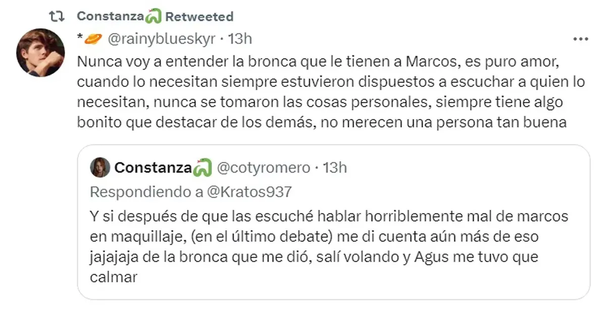 De acuerdo a lo dicho por la influencer, ambas hablaron mal del Primo en el último programa de Gran Hermano 2022, El Debate: “Las escuché hablar horriblemente de Marcos en maquillaje. De la bronca que me dio, salí volando y Agus me tuvo que calmar”.