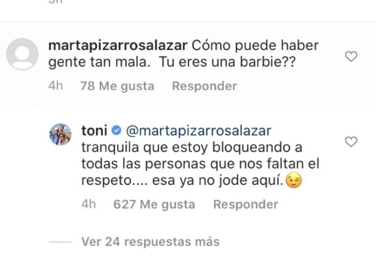 Entre tantos comentarios es que aparecieron los haters y sobretodo se la agarraron con los cambios de físico de Adamari López, cosa que hizo irritar al instructor de zumba que no dudo en reaccionar. "Tranquila que estoy bloqueando a todas las personas que nos falten el respeto. Esa ya no jode aquí", le comentó Toni Costa a una follower que tampoco comprendía la maldad de algunos seguidores de la actriz.