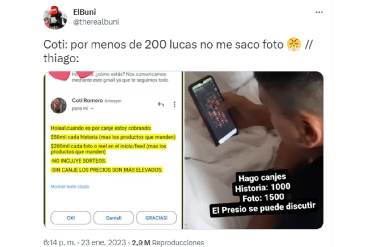Las mismas rondan en un valor de 250 mil pesos, puede ser un video simple, boomerang o una simple foto. Mientras que una foto en lo que es el feed de la cuenta tiene el monto de 600 mil pesos esto siempre hablando de publicidad. Se filtró una imagen comparativa entre lo que supuestamente cobra por canjes Coti y lo que cobra Thiago. El joven cobra la historia tan solo 1.000 pesos y una foto 1.500 pesos.