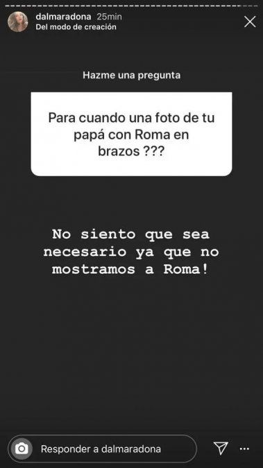 "¿Para cuándo una foto de tu papá con Roma en brazos?", fue el interrogante que originó una nueva polémica en la vida íntima de los Maradona. Dalma ha subido imágenes de la beba de espaldas o de sus piecitos y durante su embarazo pero hasta ahora, ninguna con el ex de la Selección.