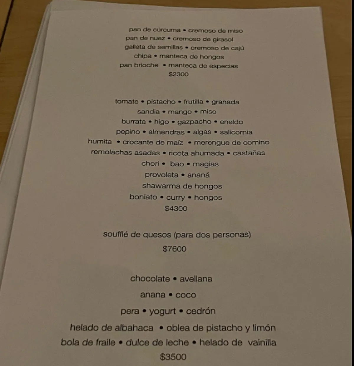 Así, los platos de la categoría de panificados cuestan $2300, mientras que los platos salen $4300 y los postres, $3500. En la carta actual hay una opción para compartir que cuesta $7600.