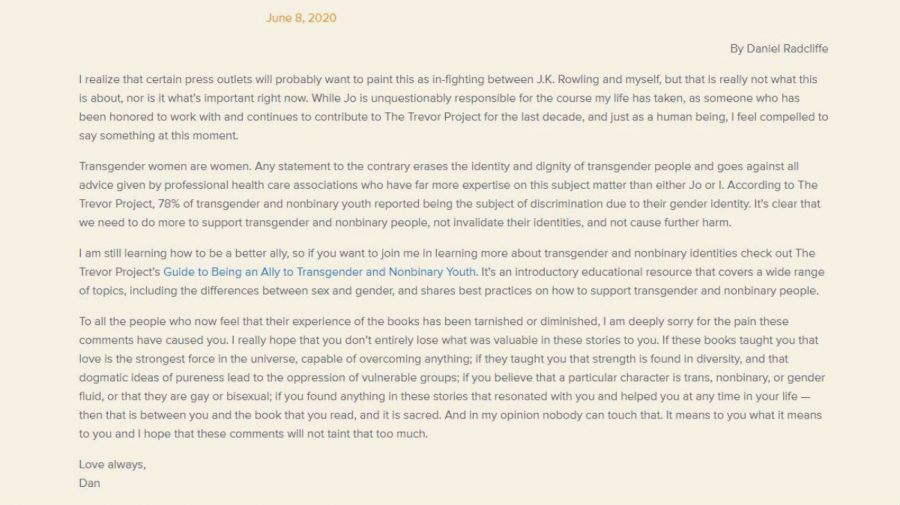 "Me doy cuenta de que ciertos medios probablemente querrán pintar esto como una pelea entre J.K. Rowling y yo, pero esto ciertamente para este propósito, ni es lo importante en este momento. Si bien Jo (J.K Rowling) es incuestionablemente la responsable del curso que ha tomado mi vida, como alguien que ha tenido el honor de trabajar y continuar contribuyendo al Proyecto Trevor durante la última década, y solo como ser humano, me siento obligado a decir algo al respecto", arrancó el texto.