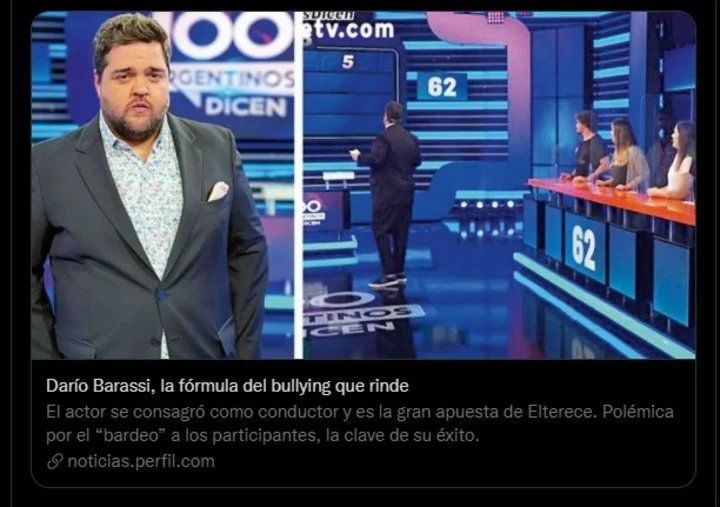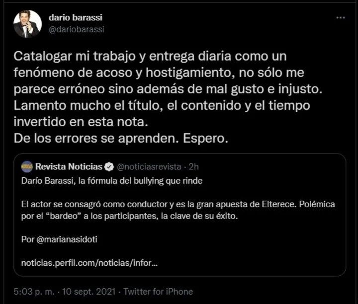 En su cuenta de Twitter, Barassi apuntó fuerte contra dicha publicación. Catalogar mi trabajo y entrega diaria como un fenómeno de acoso y hostigamiento, no sólo me parece erróneo, sino además de mal gusto e injusto. Lamento mucho el título, el contenido y el tiempo invertido en esta nota. De los errores se aprenden. Espero", sentenció el conductor en su descargo.