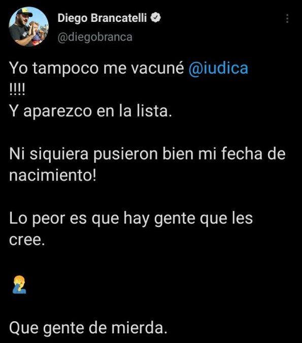Citando su tweet, el periodista Diego Brancatelli también desmintió los dichos. “Yo tampoco me vacuné, Mariano. Y aparezco en la lista. Ni siquiera pusieron bien mi fecha de nacimiento. Lo peor es que hay gente que les cree. Qué gente de mierda”, lanzó.