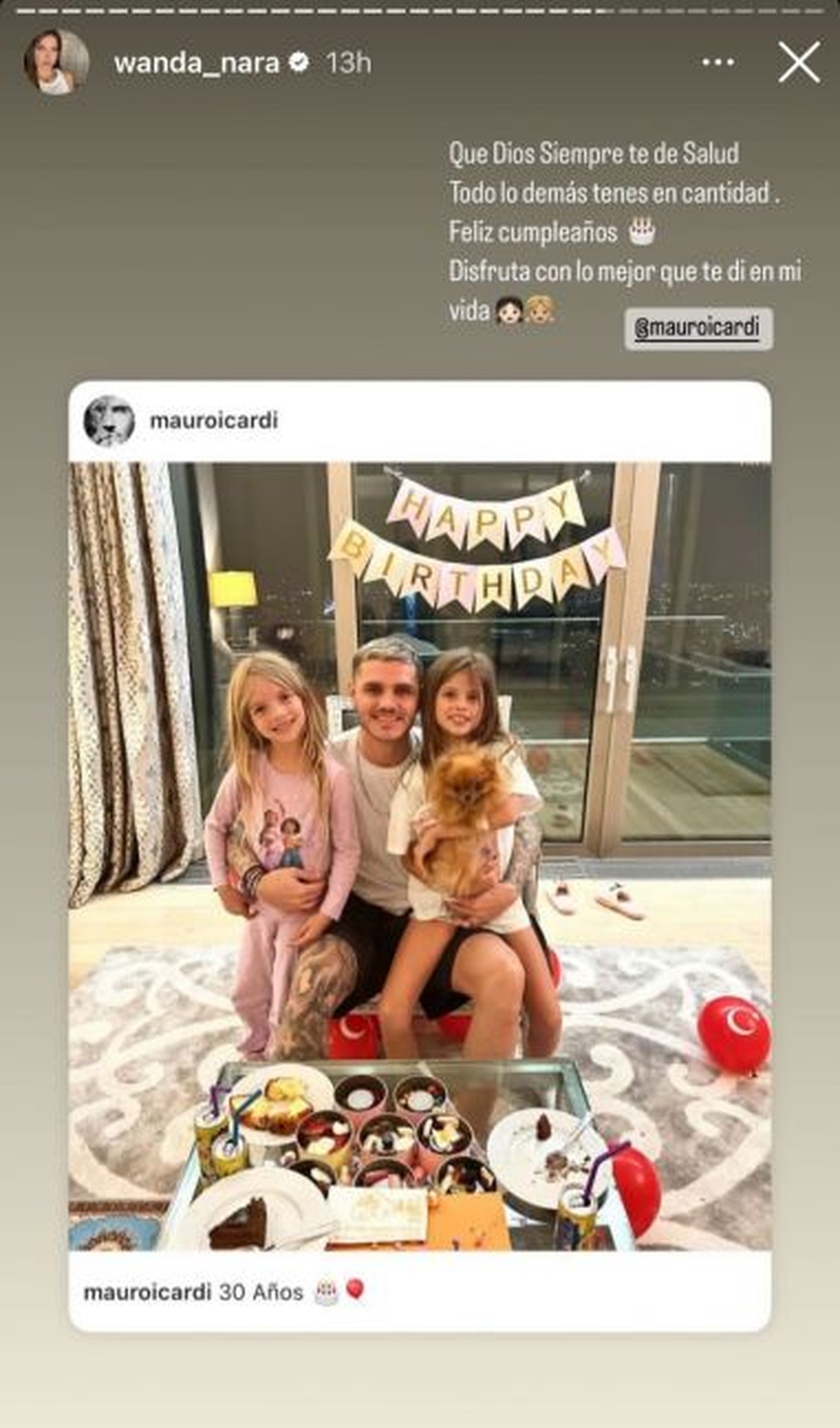 “30 años”, agregó el jugador en su cuenta de Instagram junto a la foto con sus dos hijas y la mascota de la casa. De inmediato, familiares y amigos de Wanda Nara respondieron al posteo.