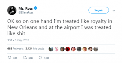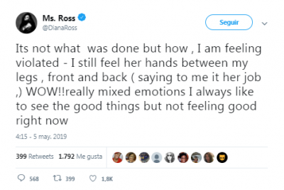 La reconocida cantante Diana Ross denunció a través de su cuenta de Twitter que recibió una inspección excesiva.