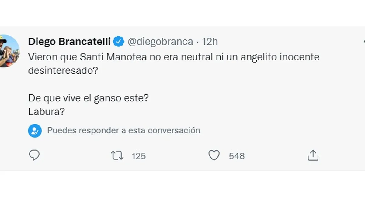 "Vieron que Santi Manotea no era neutral ni un angelito inocente desinteresado? De qué vive el ganso este? Labura?", se preguntó el periodista en Twitter, motivando mucha repercusión.
