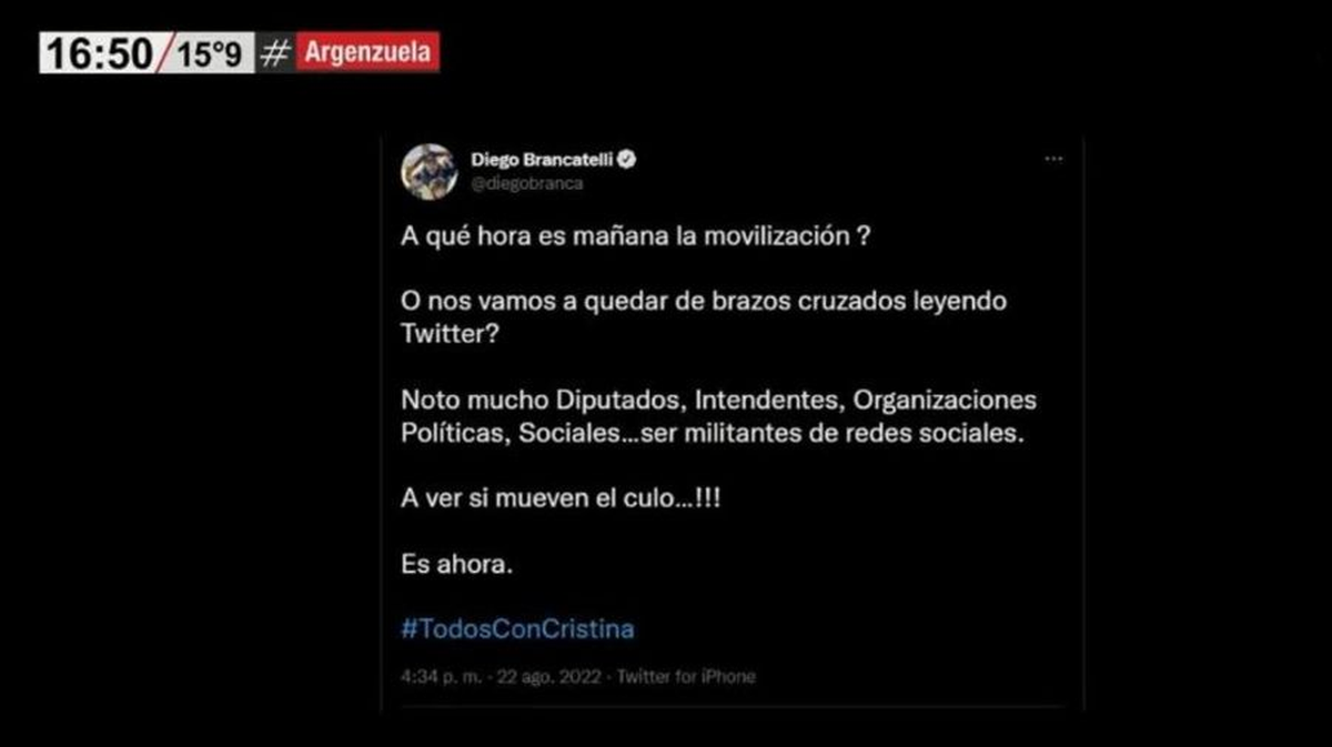El periodista militante Diego Brancatelli pidió el lunes 22 de agosto al "pueblo peronista" salir a la calle en defensa de Cristina Fernández de Kirchner después de que el fiscal Diego Luciani pidiera que sea condenada a 12 años de prisión en el juicio que se investiga el direccionamiento de la Obra Pública en Santa Cruz, e inhabilitada de manera perpetua para ejercer cargos públicos.