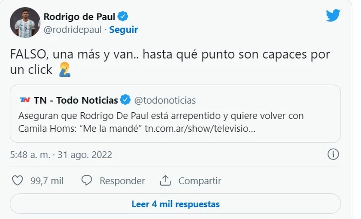 Por otro lado, en las últimas horas comenzó a circular un supuesto dicho del ex de Camila Homs, donde este se arrepentía de dejar a su ex mujer. En Socios del espectáculo (El Trece), Adrian Pallares y Rodrigo Lussich tiraron la bomba: “Hubo un llamado telefónico y una frase, ¿sabes cuál es? ‘, me parece que me mandé otra cag...’“Se lo habría dicho el mismísimo Rodrigo de Paul a sus amigos en la intimidad en referencia al fin de su relación con Camila Homs y su comienzo con Stoessel”’. Finalmente, el jugador salió a desmentir la gran ola de rumores que se generó.