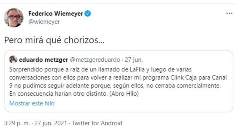 "Pero mirá qué chorizos...", escribió el conductor de TN Tecno y Radio Berlín 107.9 en su cuenta de Twitter junto al mensaje del productor.