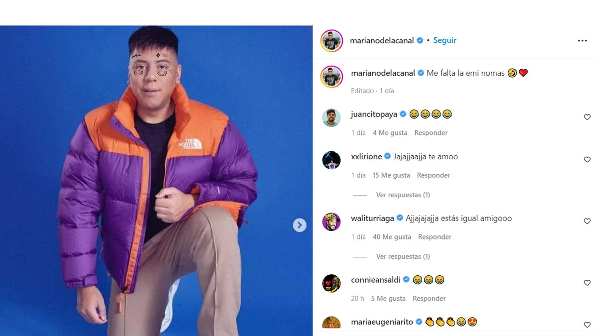"Me falta la Emi nomás", expresó con humor Mariano en su posteo, haciendo referencia a Emilia Mernes, actual novia de Duki. La foto generó gran repercusión y se viralizó debido al impactante parecido entre los dos.