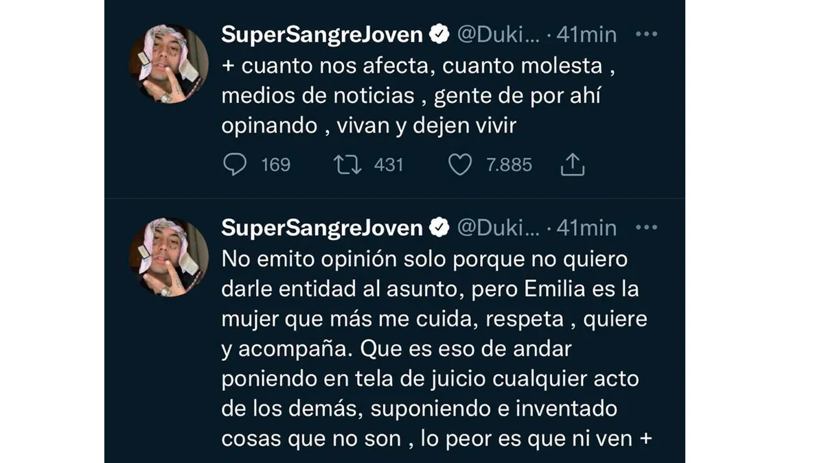 Sin embargo, Duki decidió usar Twitter para hacer una fuerte declaración al respecto y aclarar los tantos: "O tal vez Emilia salió con su equipo de Sony, del cual Paco (el chico que vemos ahí) es parte. Por el amor de Dios dejen de meterse en nuestra relación. Con Emilia vivo todo los días 24hs al día, y ustedes ni se enteran. Les pido que no opinen más, realmente nos afecta".