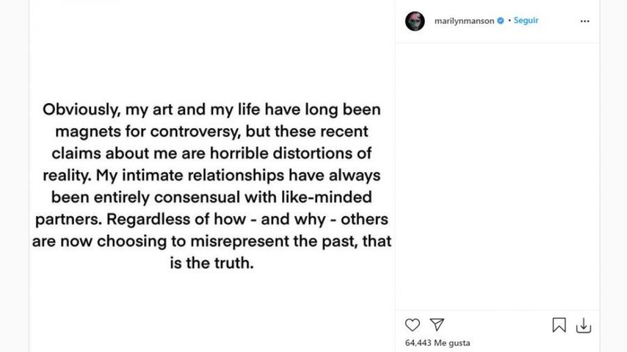 Manson respondió a las acusaciones de Wood en un post de Instagram el lunes por la noche. "Obviamente, mi arte y mi vida han sido durante mucho tiempo imanes para la controversia, pero estas recientes afirmaciones sobre mí son horribles distorsiones de la realidad", escribió.
