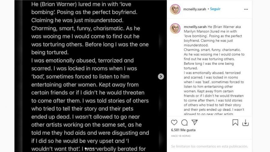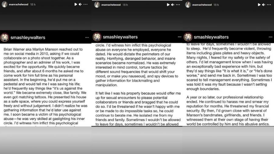 Apenas trascendió la denuncia pública de Eva Rachel Wood, otras cinco mujeres decidieron salir a apoyar a la actriz contando sus propias y aterradoras experiencias con Marilyn Manson. A través de sus cuentas de Instagram, las mujeres hablaron de los terrores nocturnos, ansiedad y trastorno de estrés postraumático que les dejó el cantante. A todas les pedía un "pacto de sangre", las engañaba, las drogaba, abusaba de ellas y las encerraba en habitaciones.