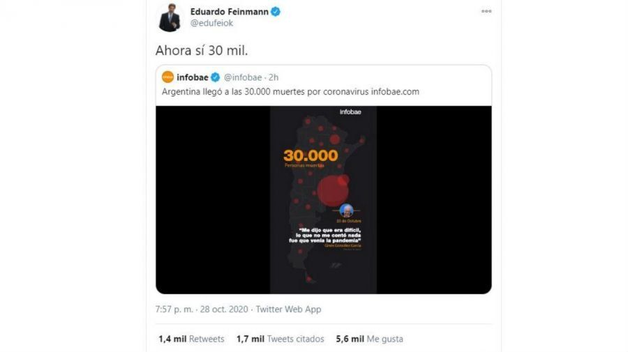 Eduardo Feinmann se hizo eco de la noticia primero en la red y, citando un tuit de Infobae con la información confirmada por el ministerio comandado por Ginés González García, escribió "Ahora sí 30 mil" aprovechando el número para compararlo con el de los desaparecidos durante la dictadura militar argentina.