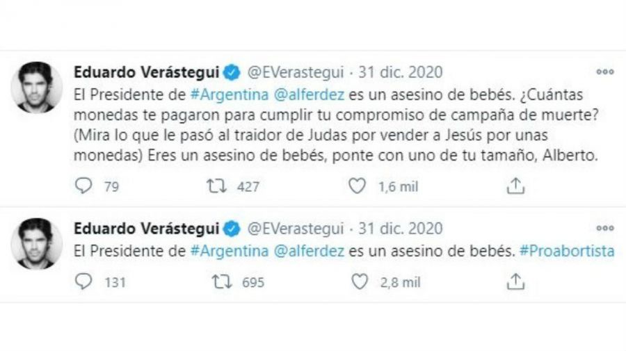 "El Presidente de Argentina @alferdez es un asesino de bebés. ¿Cuántas monedas te pagaron para cumplir tu compromiso de campaña de muerte? (Mira lo que le pasó al traidor de Judas por vender a Jesús por unas monedas) Eres un asesino de bebés, ponte con uno de tu tamaño, Alberto", había lanzado sin miedo al escándalo por la mañana. Mensaje que repitió por la tarde.