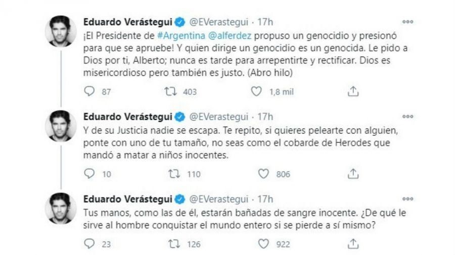 En las últimas horas, el actor de Soñadoras, Chasing Papi y Charmed, ferviente seguidor de la iglesia católica y conocido por su lucha contra el aborto, escribió en su cuenta oficial de Twitter: "¡Alberto Fernández, presidente de Argentina, propuso un genocidio y presionó para que se apruebe! Y quien dirige un genocidio, es un genocida. Le pido a Dios por ti, Alberto; nunca es tarde para arrepentirse y rectificar. Dios es misericordioso, pero también es justo y de su justicia nadie se escapa", proclamó Verástegui arrobando al mandatario argentino en su tuit.