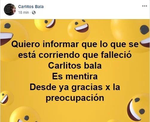 La página de Facebook homenaje a Carlitos publicó un breve comunicado desmintiendo la información. “Quiero informar que lo que se está corriendo que falleció Carlitos Balá es mentira. Desde ya, gracias por la preocupación”, expresaron en el sitio, según informa Ciudad.