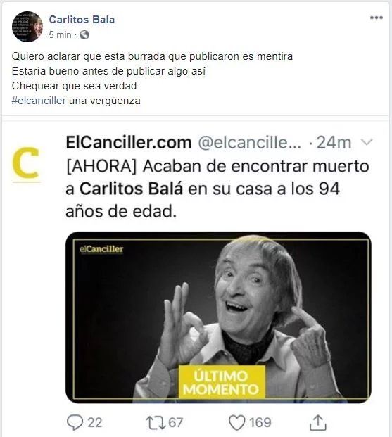 Muchos se lamentaron en Twitter al leer una dolorosa información. Una cuenta falsa de un sitio de noticias publicó que Carlitos Balá había muerto a los 94 años. Inmediatamente, la información comenzó a propagarse por la red social y WhatsApp, despertando preocupación en todas las generaciones que crecieron y vibraron con el querido artista. Afortunadamente, la noticia no es cierta.