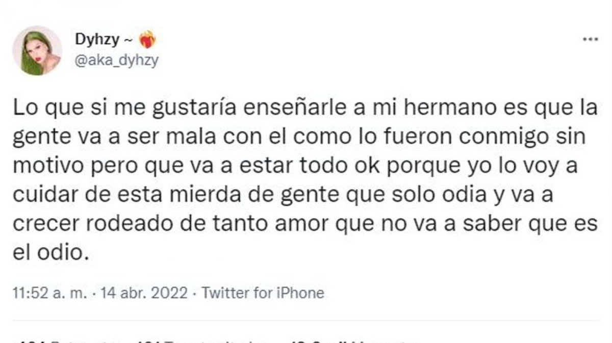 Tani Fernández, conocido como Dyhzy, brindó un contundente mensaje en el marco del nacimiento de Francisco, su hermano, fruto de la unión del presidente Alberto Fernández y la primera dama Fabiola Yañez. En un posteo, aseguró que cuidará del pequeño de "la mierda de gente que solo odia". "Lo que si me gustaría enseñarle a mi hermano es que la gente va a ser mala con él como lo fueron conmigo sin motivo pero que va a estar todo ok porque yo lo voy a cuidar de esta mierda de gente que solo odia y va a crecer rodeado de tanto amor que no va a saber que es el odio", escribió el DJ y Drag Queen en su posteo realizado en su cuenta de Twitter.
