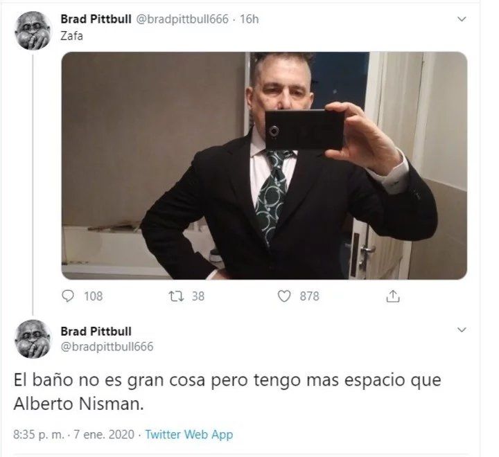 "Zafa", escribió Calamaro sobre su foto apuntando al espejo, y enseguida comentó: "El baño no es gran cosa pero tengo mas espacio que Alberto Nisman".