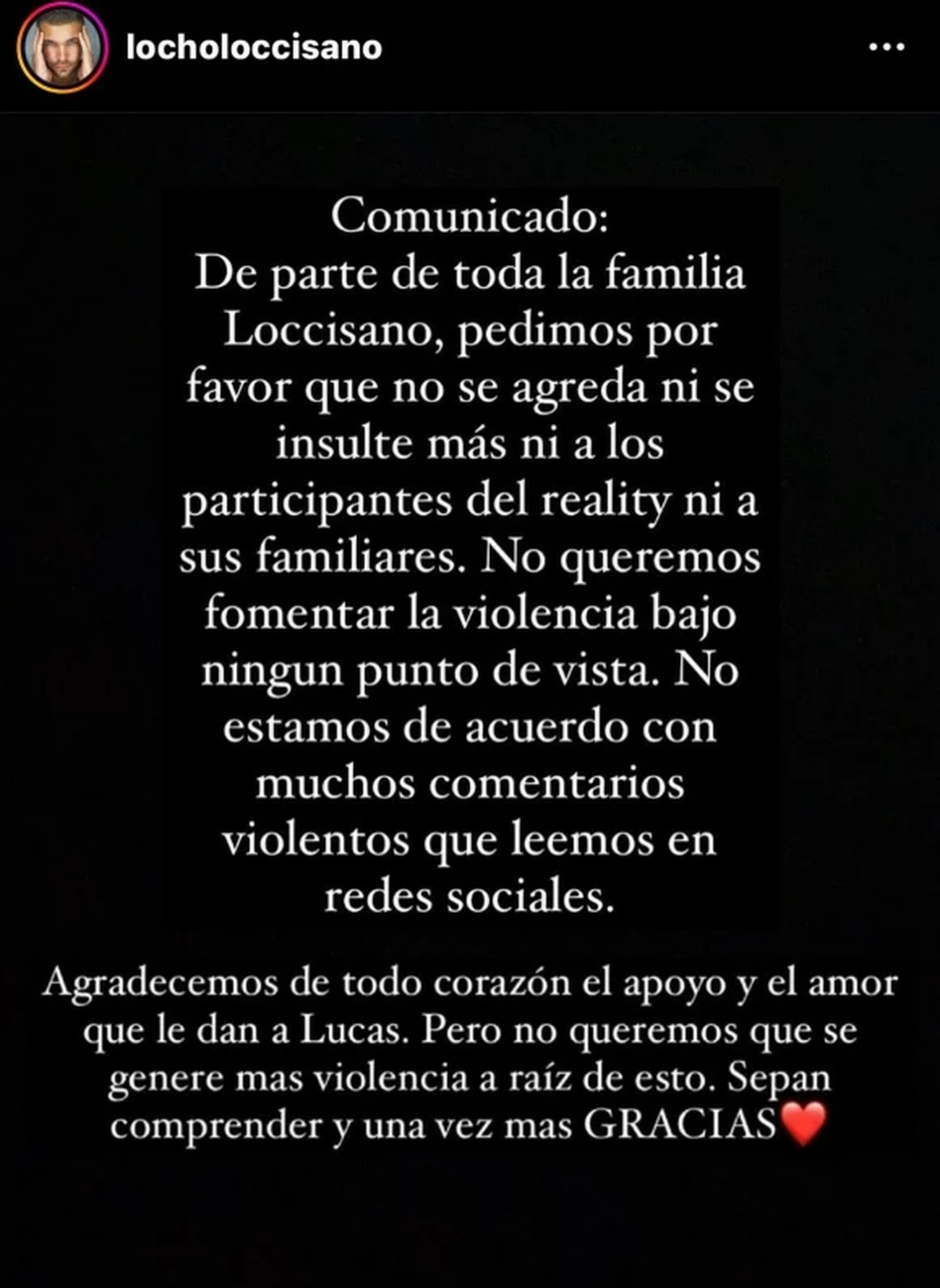 “De parte de toda la familia Loccisano, pedimos por favor que no se agreda ni se insulte más ni a los participantes del reality ni a sus familiares. No queremos fomentar la violencia bajo ningún punto de vista”, decía el mensaje.
