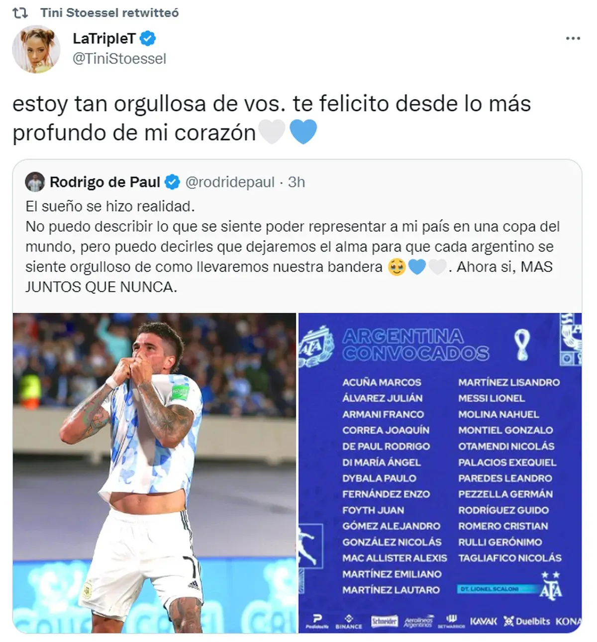 En su cuenta de Twitter, Tini Stoessel felicitó a su pareja, Rodrigo de Paul, tras la convocatoria de Lionel Scaloni para jugar en la Selección en el Mundial Qatar 2022.